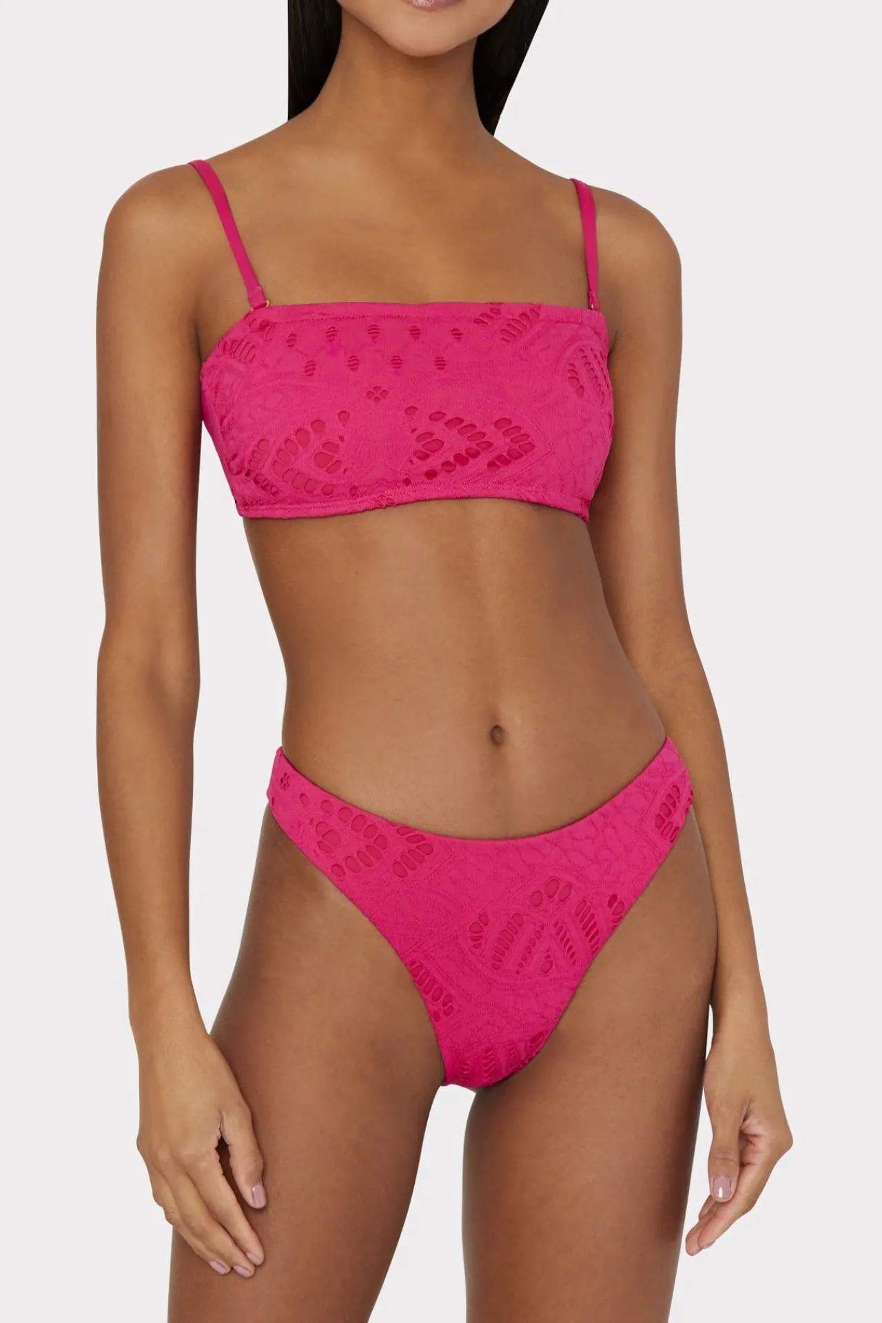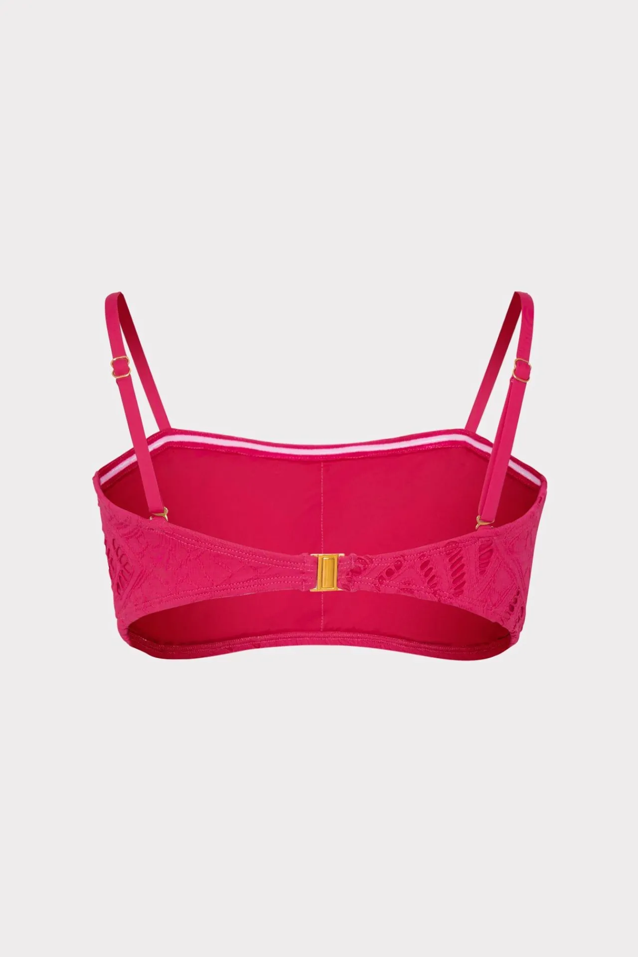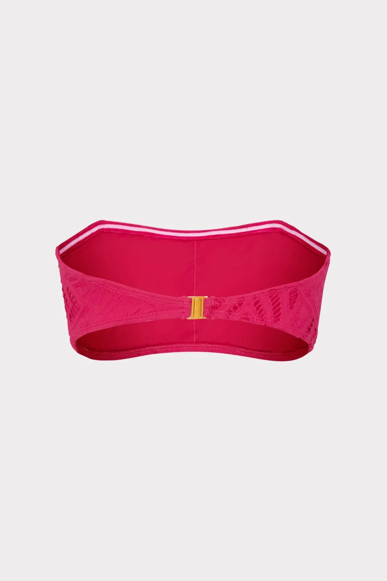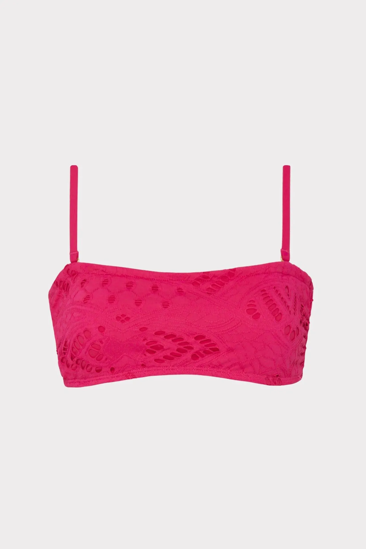 Made From A Unique Lace Eyelet Swim Fabric, This Classic Bandeau-Style Bikini Top Has Removable Cups And Clasps In The Bag To Close. Wear It With Its Coordinating Lace Eyelet Bikini Bottom. Its Pink Color Pairs Perfectly With All Of Our Milly Cover-Up Dresses.