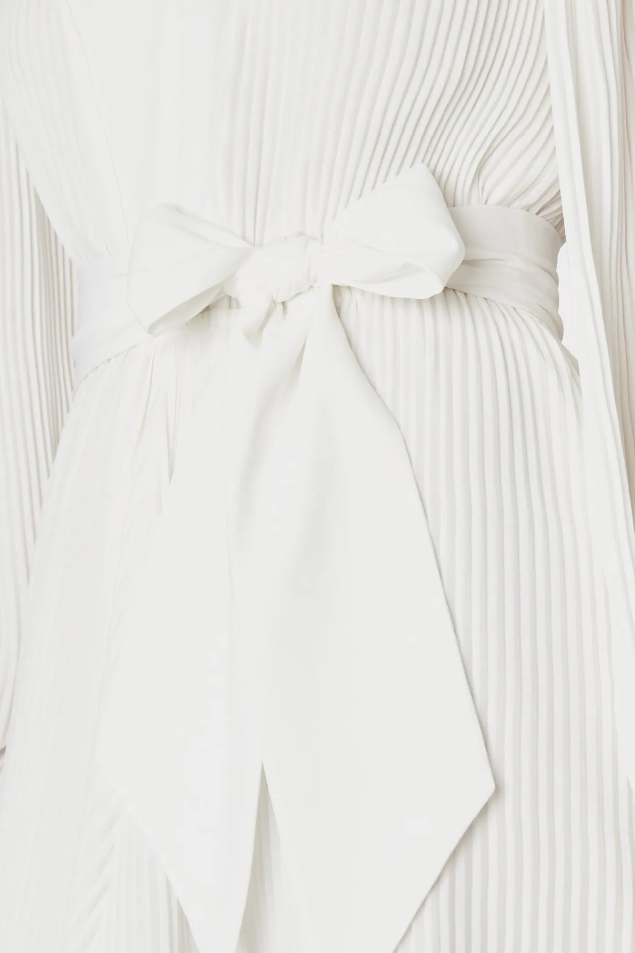 This White Pleated Short Dress Features A Slim Peasant Sleeve, A V-Neckline, A Pleated Skirt, And A Tie At The Waist For…