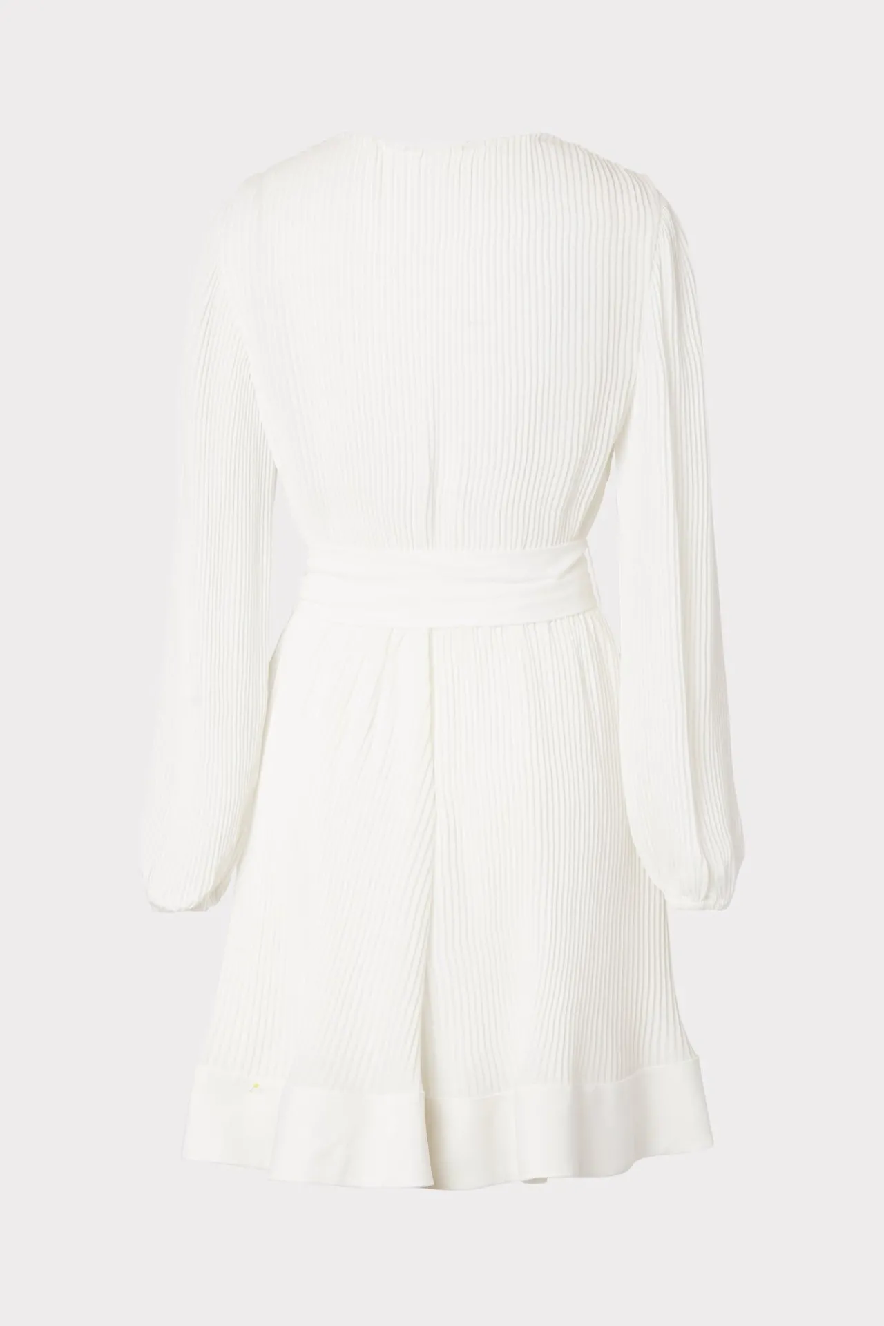 This White Pleated Short Dress Features A Slim Peasant Sleeve, A V-Neckline, A Pleated Skirt, And A Tie At The Waist For Added Shape. It Works So Well For Both Day And Night.