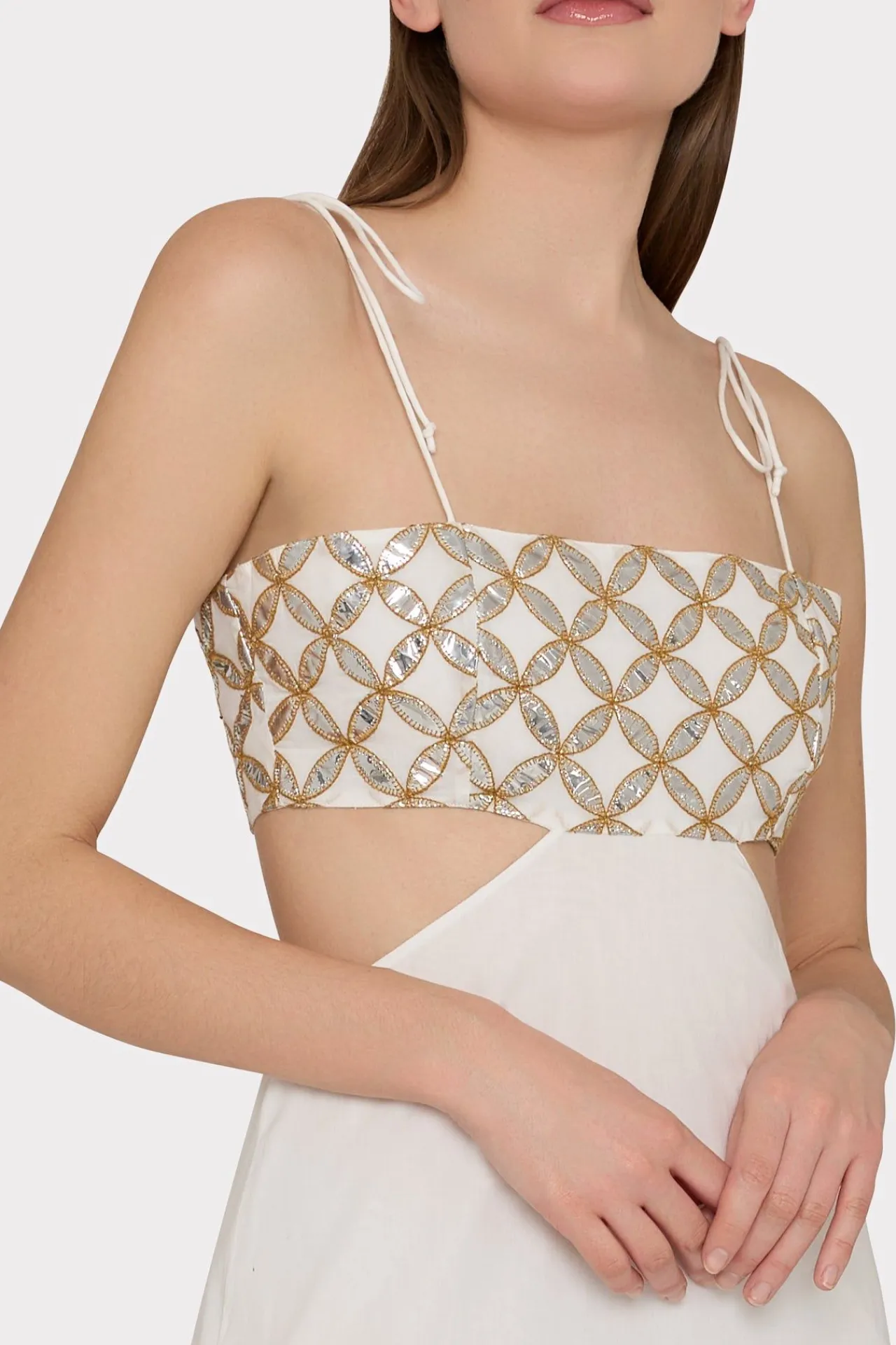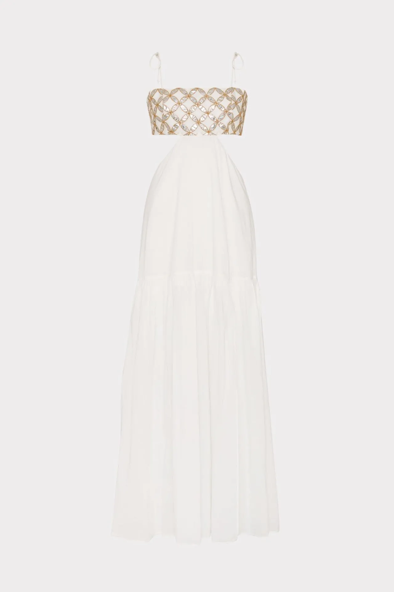 Made From 100% Lightweight Cotton, This Airy Cover-Up Has Side Cutouts, Side Slits, And An Open Back. Along The Bust, It’S Embellished With A Gold, Mirrored Embroidery Detail. It’S Flowy, Tiered Skirt Falls To A Maxi-Length Hemline.
