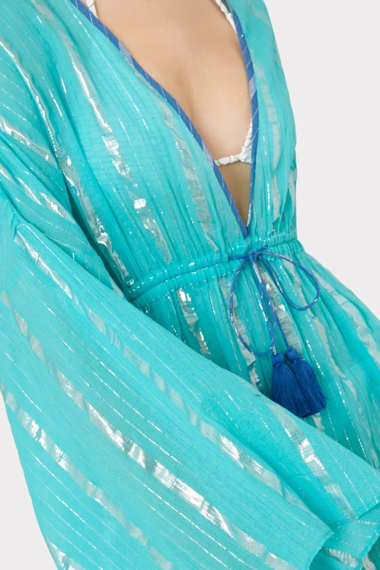 Cut From A Lightweight Cotton With Lurex Vertical Stripe Detail Throughout, This Deep V-Neck Coverup Dress Is Perfect For The Most Glamorous Of Beach Destinations. It Features Airy, Long Sleeves And An Adjustable Tie At The Waist That’S Finished With A Tassel Detail. Choose Your Best Color And Wear It Over Your Favorite Milly Swimwear.