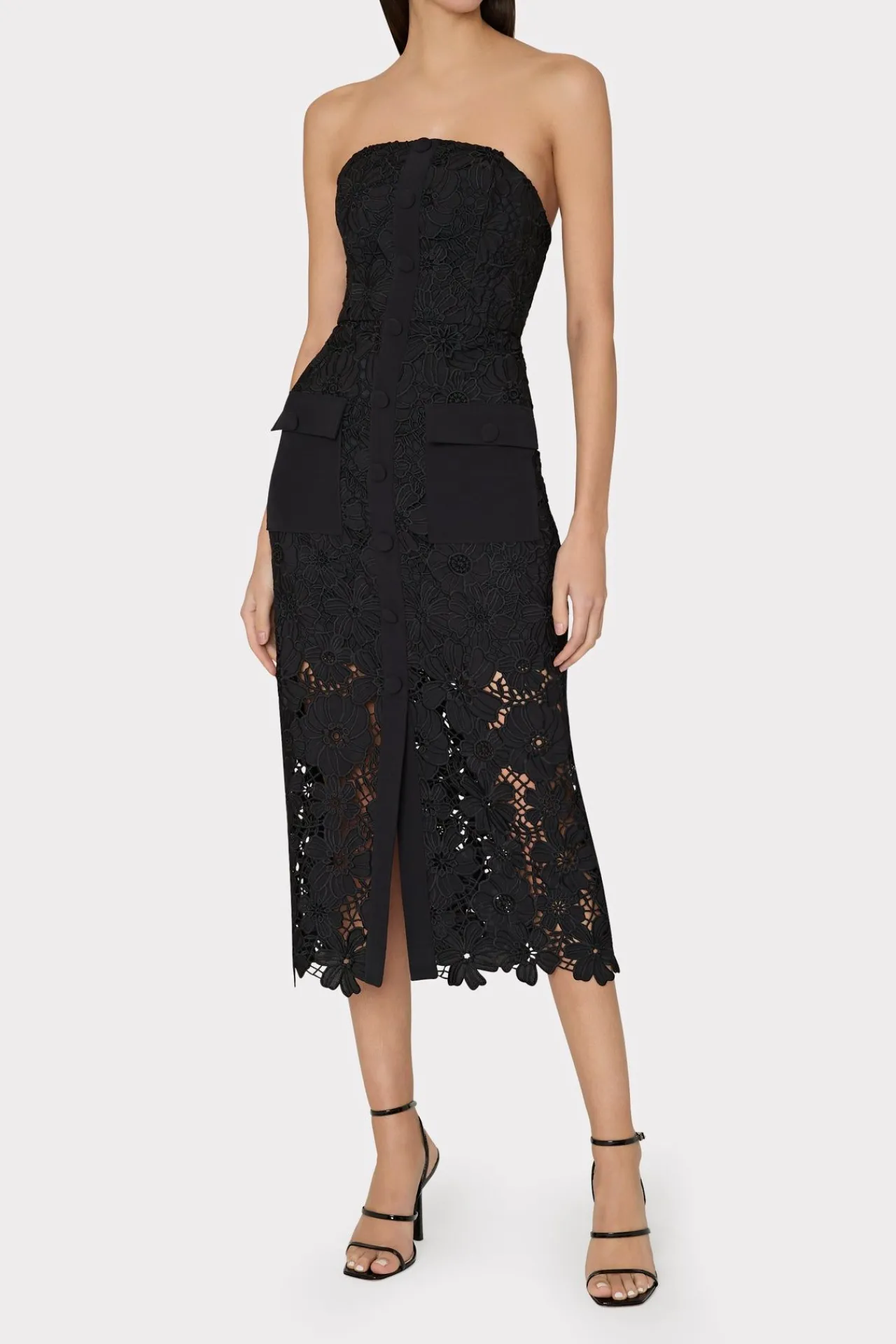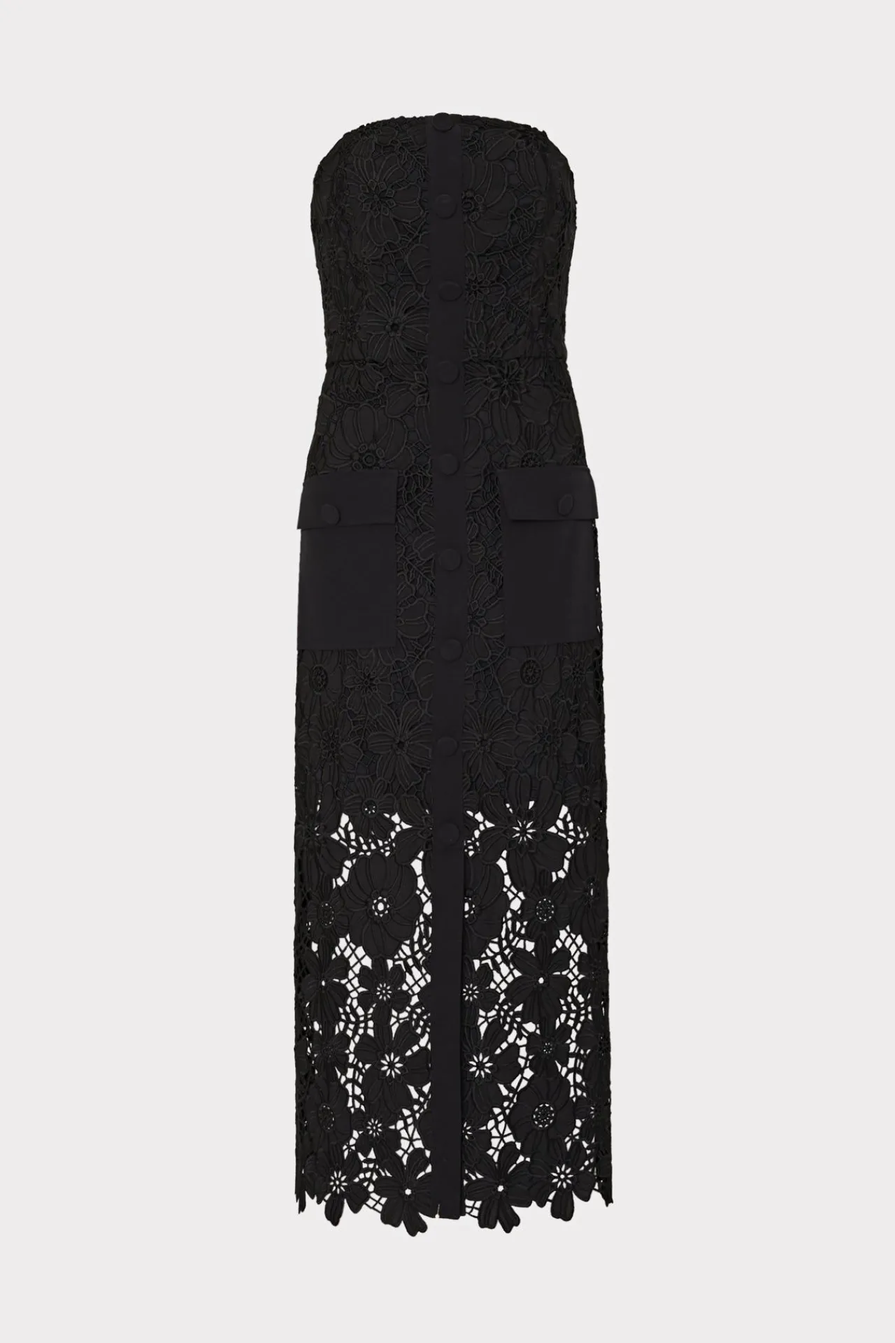 Rendered From Stunning Embroidered Floral Lace, This Sleek, Strapless Dress Style Is Ready For All Of Your Spring And Summer Cocktail Parties. It’S Lined To The Mid-Thigh To Reveal Bare Legs Past The Knee. For The Finishing Touches, The Adrienne Roja Dress Features Non-Functional Button Detail Down The Center And Pocket Detail At The Hips.