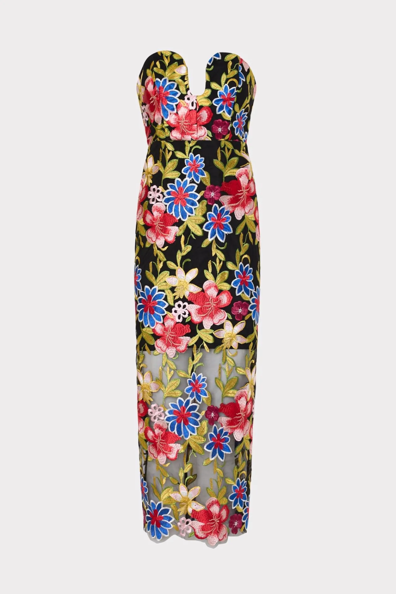 This Sleek Strapless Dress Style Features Our Signature Floral Mesh Embroidery That Serves As An Overlay To Reveal Bare Legs Past The Knee. For Spring, It’S Done In Our Bold, New Spanish Garden Floral Print.