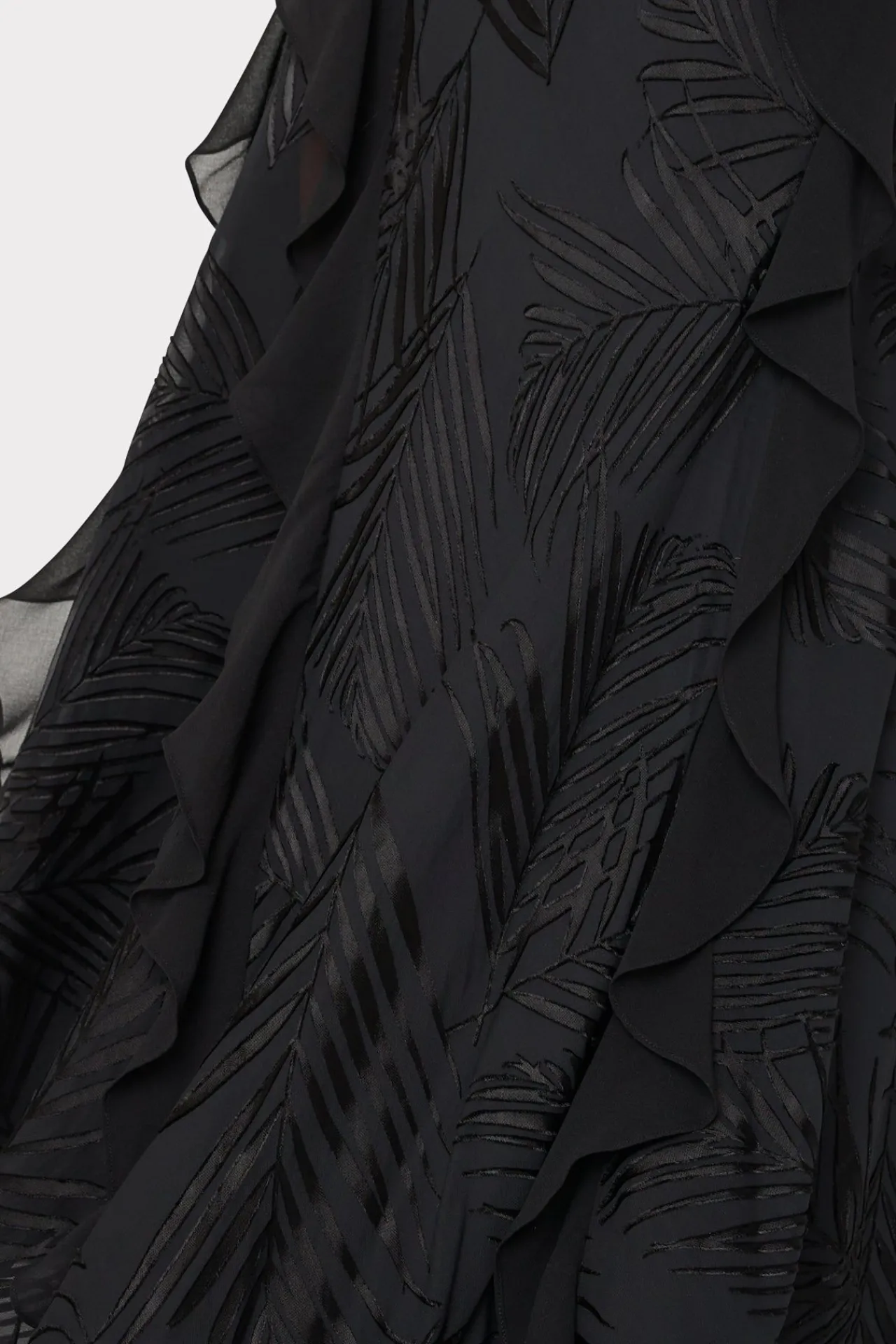 Rendered From A Beautiful Chiffon Devore Fabric, This Ultra Glamorous One-Shoulder Dress Is Accented With Velvet Leaf Print Detail On Its Cascading Skirt.