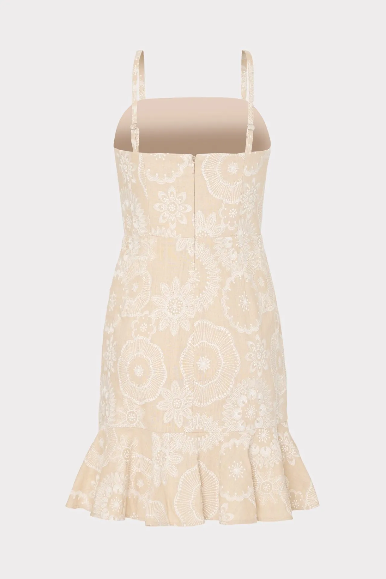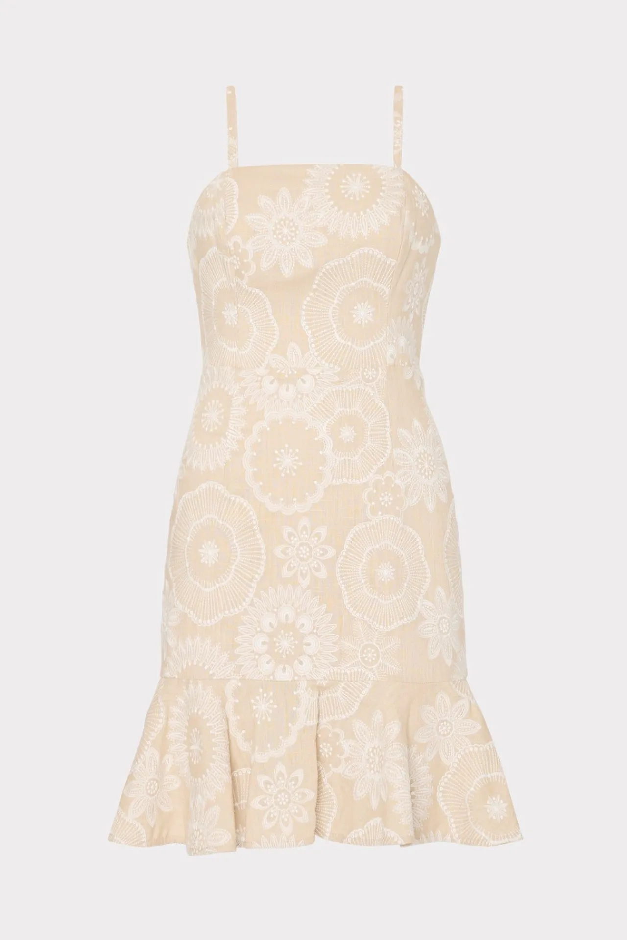 Crafted From Crisp Linen Fabric With A Natural-Colored Embroidery, This Fitted Mini Dress Has Adjustable Straps And Is Adorned With A Single Ruffle Along The Hemline.