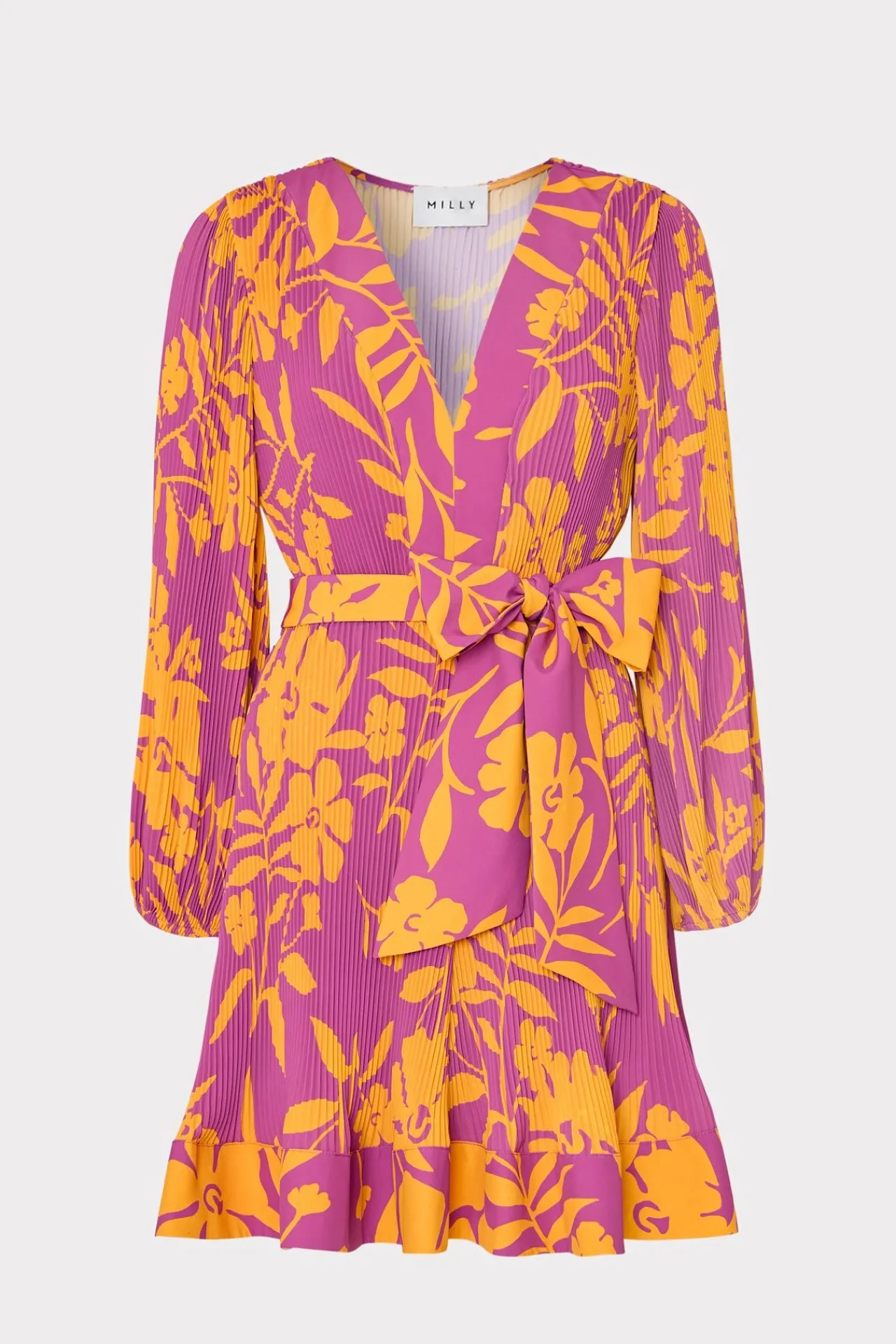 This Easy-To-Wear Pleated Short Dress Features A Slim, Long Sleeve, A V-Neckline, A Milly Signature Pleated Skirt, And A Tie At The Waist For Added Shape. For The Resort Season, It Comes In Our New Multicolored Marigold Aroma Prints.