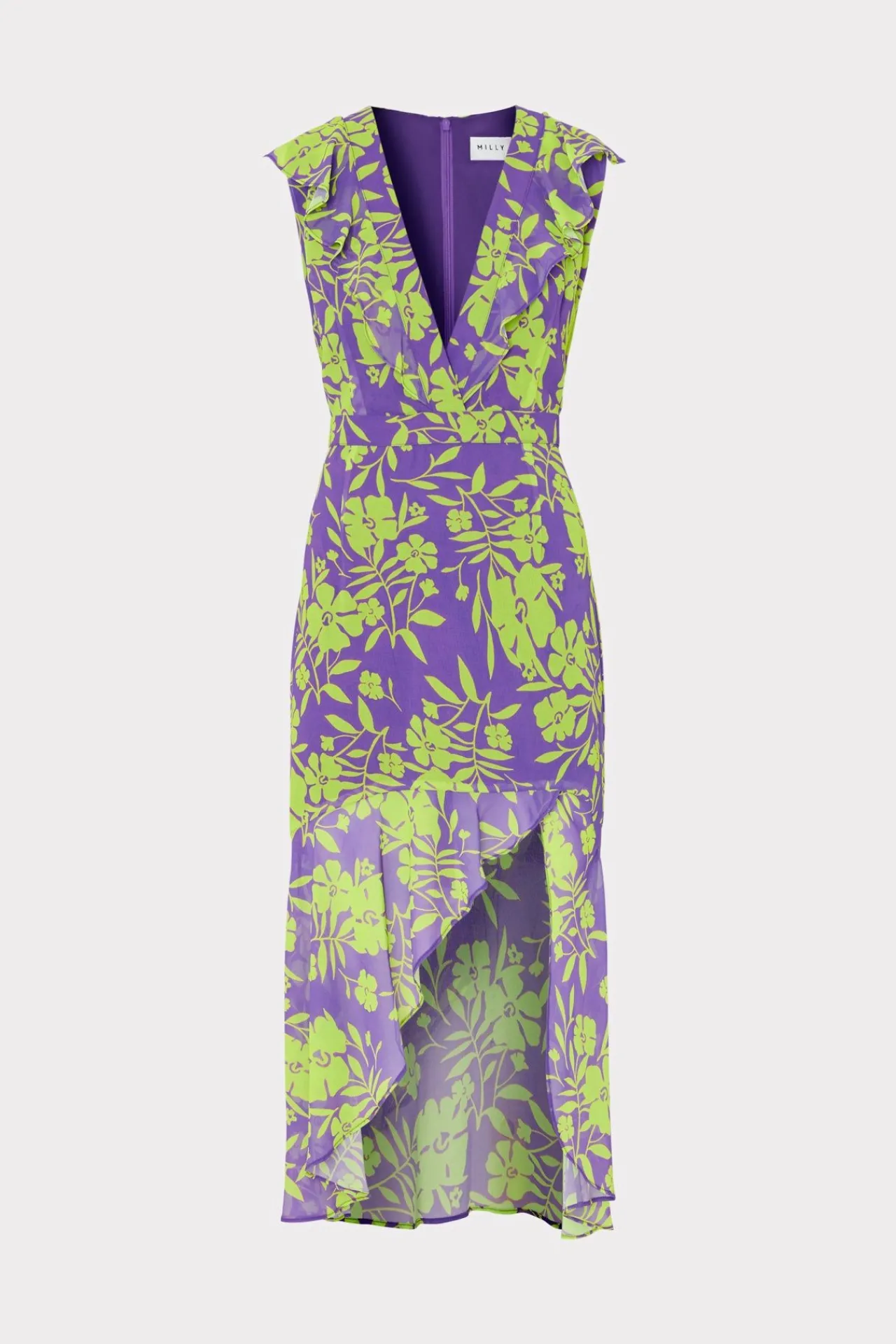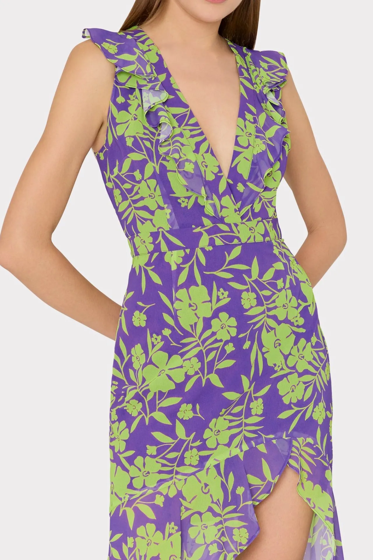 Done In Our New Marigold Aroma Print, The Nanci Is A Sultry, Ruffly Number With An Asymmetrical Hemline. Throw On A Matching Heel For All Of Your Winter Vacation Dinners And Parties.