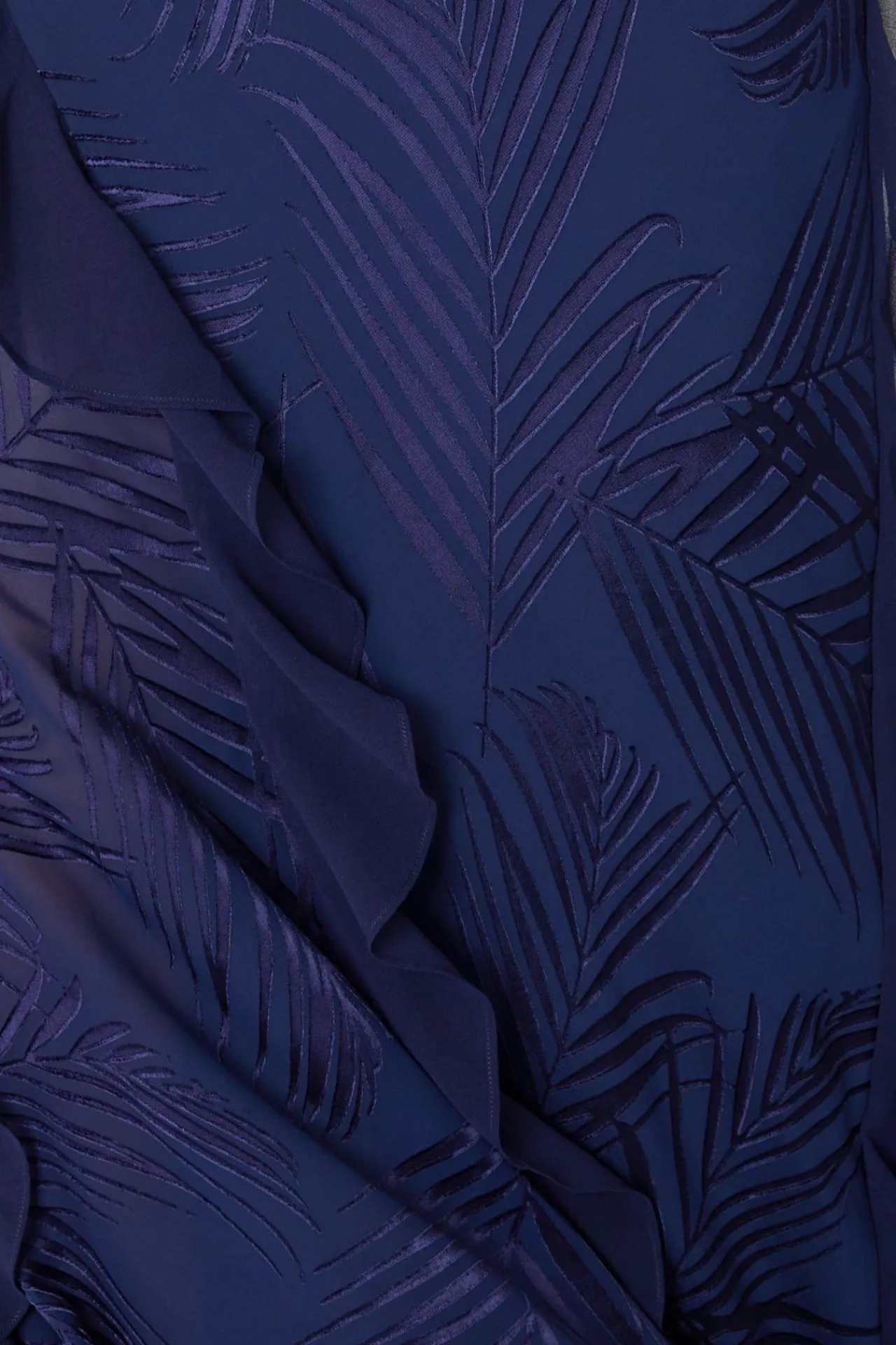 Rendered From A Beautiful Chiffon Devore Fabric, This Ultra Glamorous One-Shoulder Dress Is Accented With Velvet Leaf Print Detail On Its Cascading Skirt.