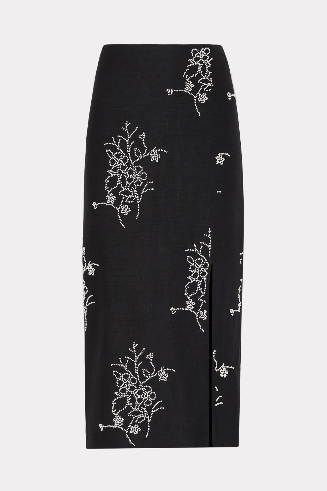 Cut From Luxe Lightweight Linen, This Midi Length Skirt Is Embellished With Embroidered Beaded Detail. It Has A Considerable Side Slit To Show Some Skin And For Ease Of Movement. Wear Yours With Its Coordinating Crop Top.