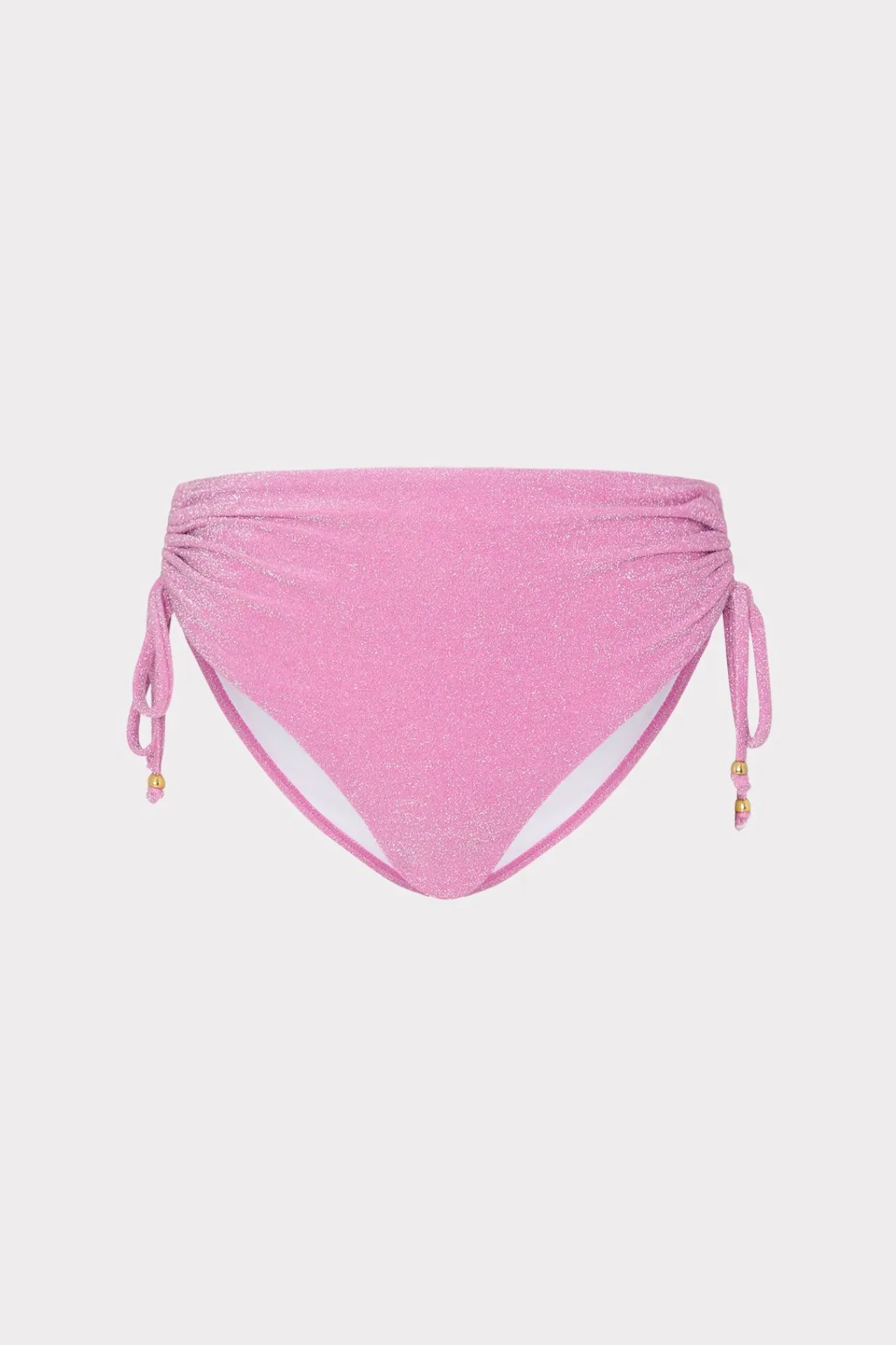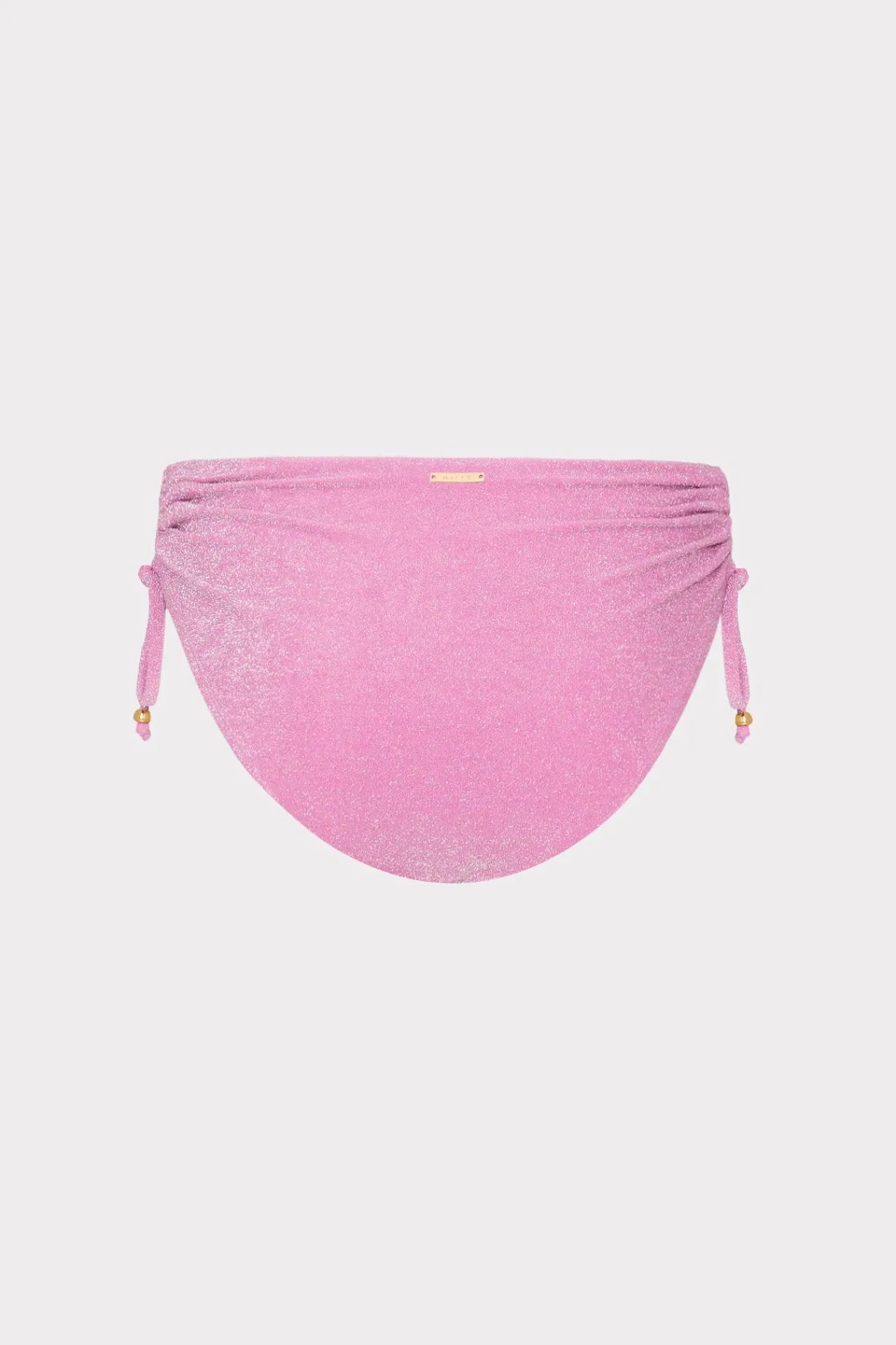 Cut From Luxe Sustainable Italian Swim Fabric, This Shimmery Bikini Bottom Is A Chic, Mid-Waisted Style With Ruching Detail And Ties On Both Sides. Wear It With Its Coordinating Shimmer Halter Bikini Top.