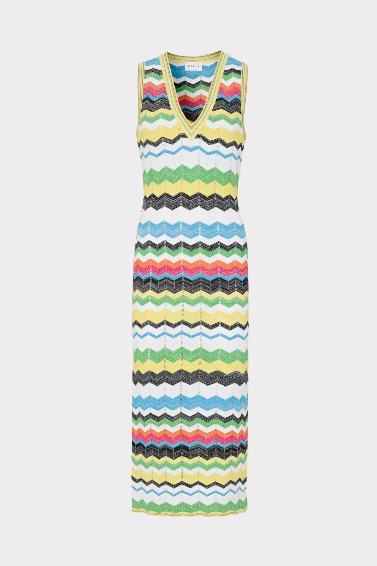 Every Season, Milly Offers An Updated Take On Our Iconic Luxe Knits. For Spring, Our Zig Zag Chevron Knit Fabric Comes In Multicolored Stripes With Metallic Detail Throughout. It’S Cut To Fit Close To The Body, Has A V-Neckline With Trim And Flattering Side Slits For Ease Of Movement. Wear It With Flat Slides During The Day Or Dress It Up With Heels.