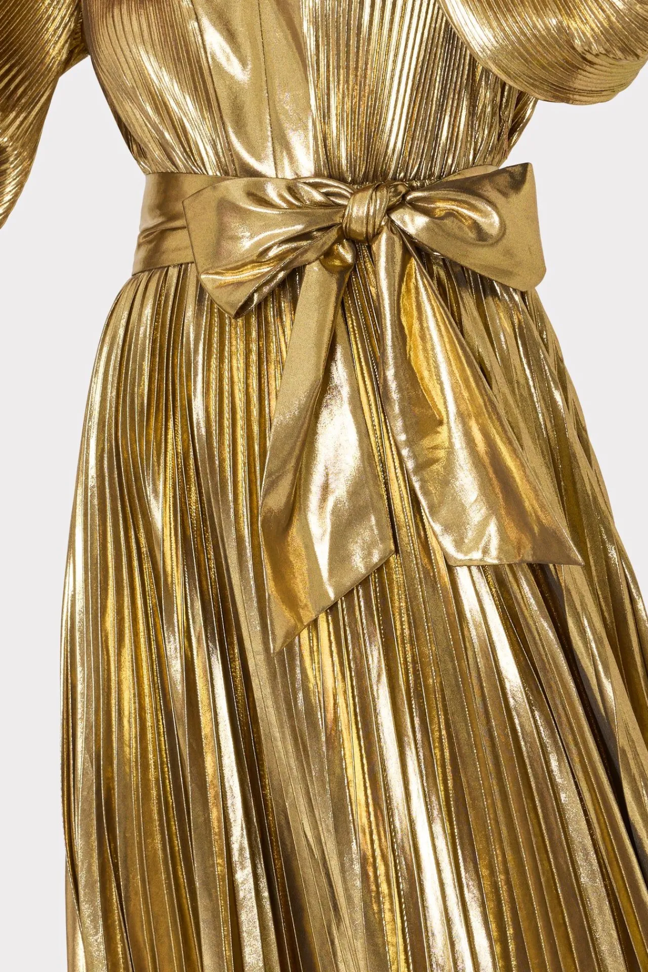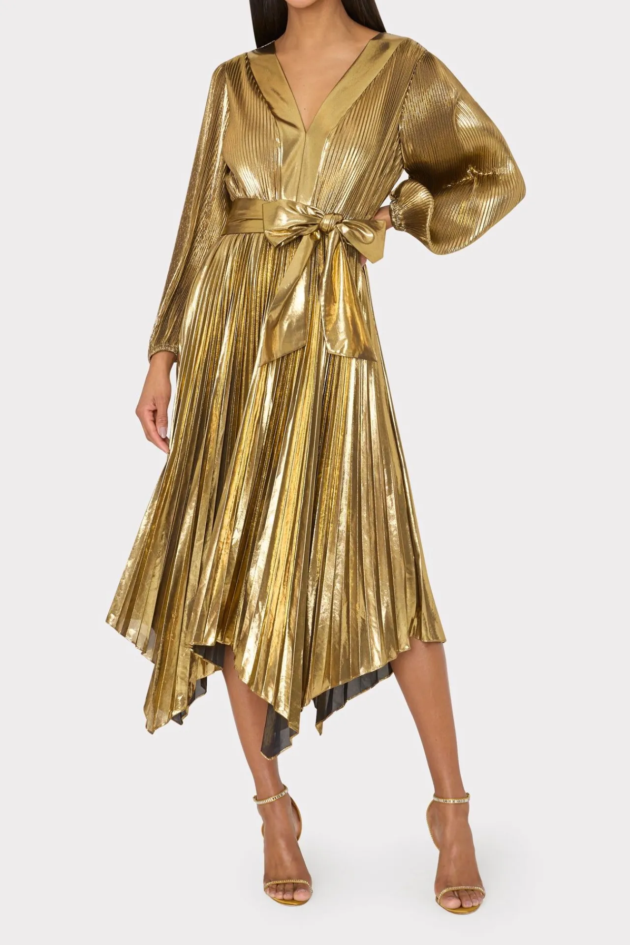 The Liora Is An Easy-To-Wear Silhouette That Features A Slim, Long Sleeve, A V-Neckline, A Milly Signature Pleated Skirt, And A Tie At The Waist For Added Shape. It Has An Uneven Hemline That Perfectly Drapes To A Midi Length. This Season, It’S Offered In Our New, High-Shine Lamé Fabric.
