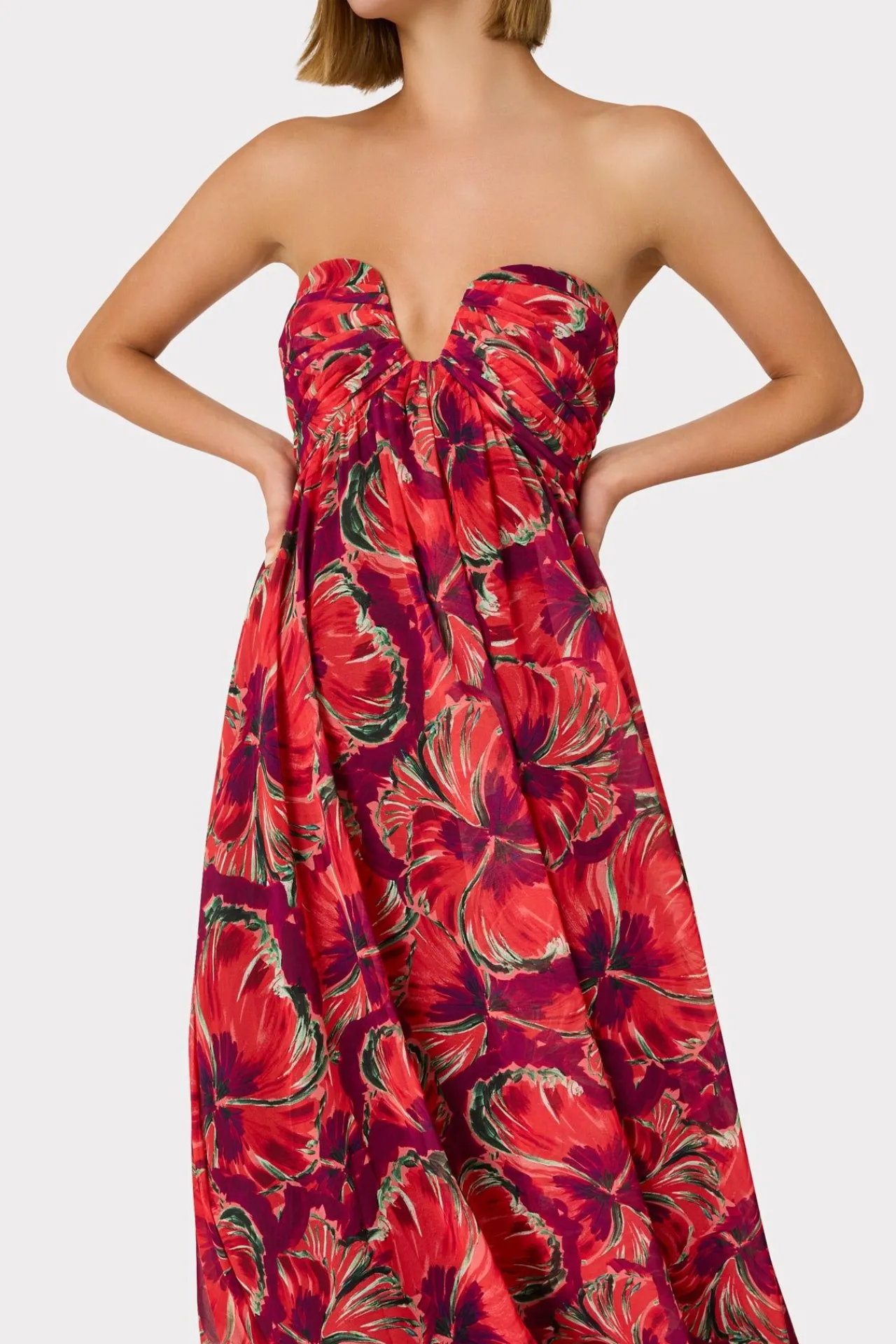 Rendered From A Luxurious, Pleated Chiffon Floral Fabric, This Fluid Maxi Dress Style Features A Wired Strapless Neckline. Wear Yours To All Of Your Upcoming Spring Soireés.