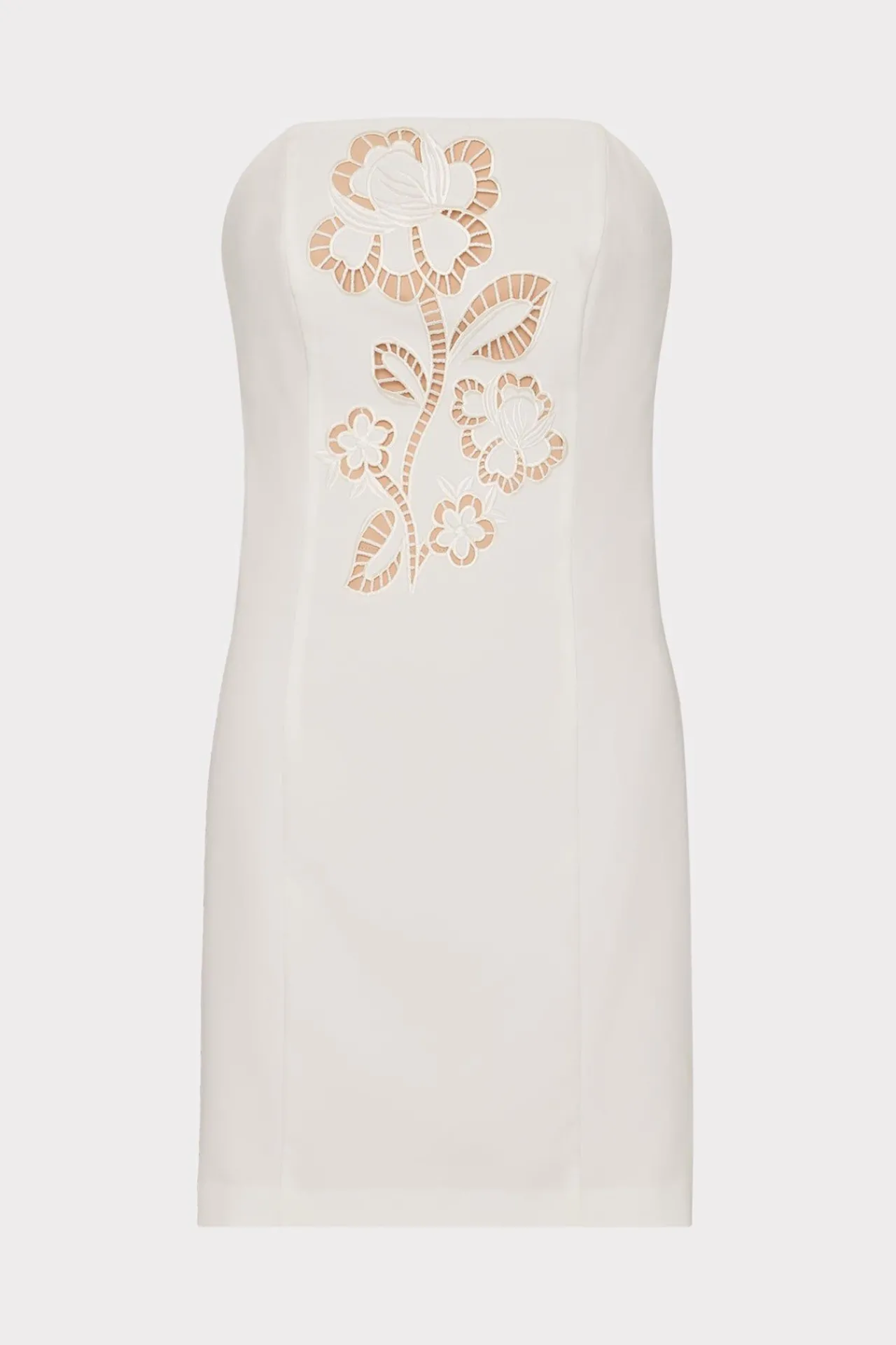 Cut From Our Luxurious Cady Fabric, This Strapless Mini Dress Style Is Accented With A Floral Laser Cut Detail And Is Fi…