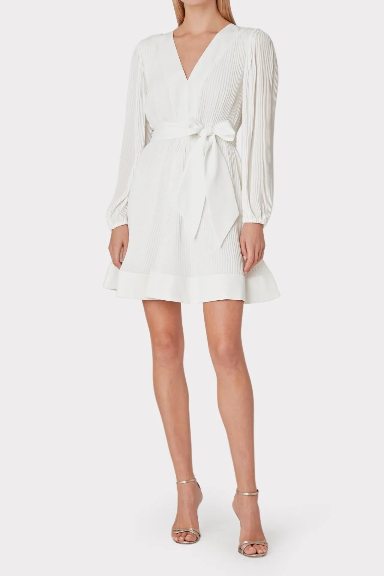 This White Pleated Short Dress Features A Slim Peasant Sleeve, A V-Neckline, A Pleated Skirt, And A Tie At The Waist For Added Shape. It Works So Well For Both Day And Night.