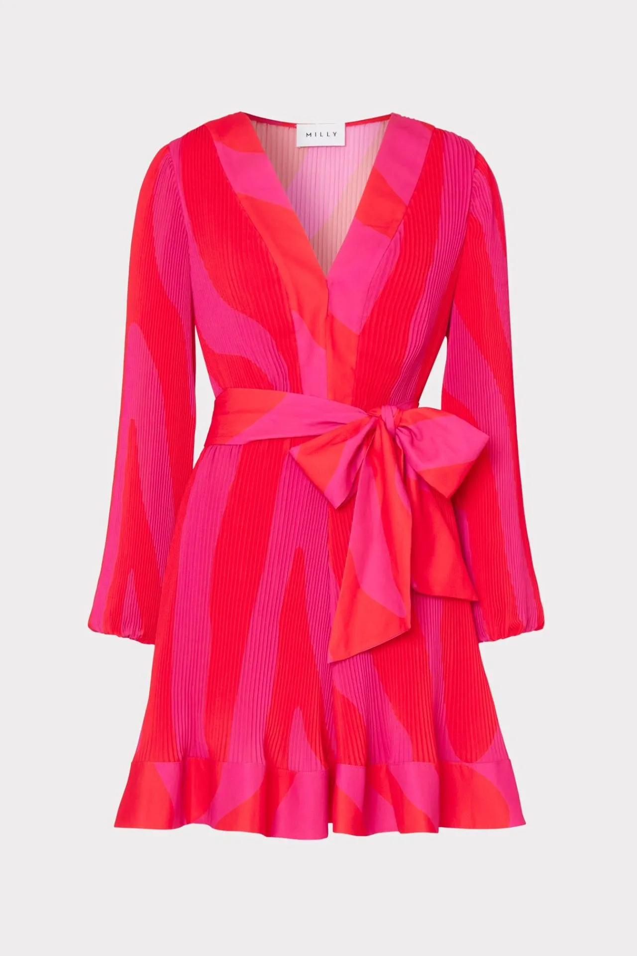 This Easy-To-Wear Pleated Short Dress Features A Slim Long Sleeve, A V-Neckline, A Milly Signature Pleated Skirt, And A Tie At The Waist For Added Shape. For The Spring Season, It Comes In A Zebra Print Featuring Our Iconic Milly Pink.