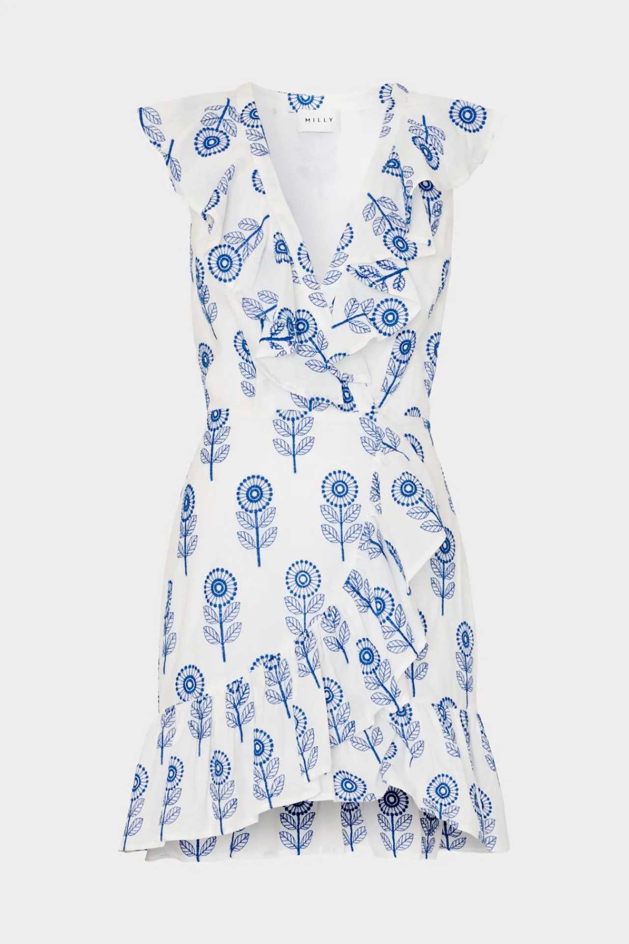 Cut From 100% Cotton, The Novi Poppy Mini Dress Is Defined By Intricate Blue Embroidery Atop Stark White. It Features A Surplice Neckline, A Faux Wrap Skirt, And Is Finished With Ruffle Detail On Both The Bodice And Skirt.