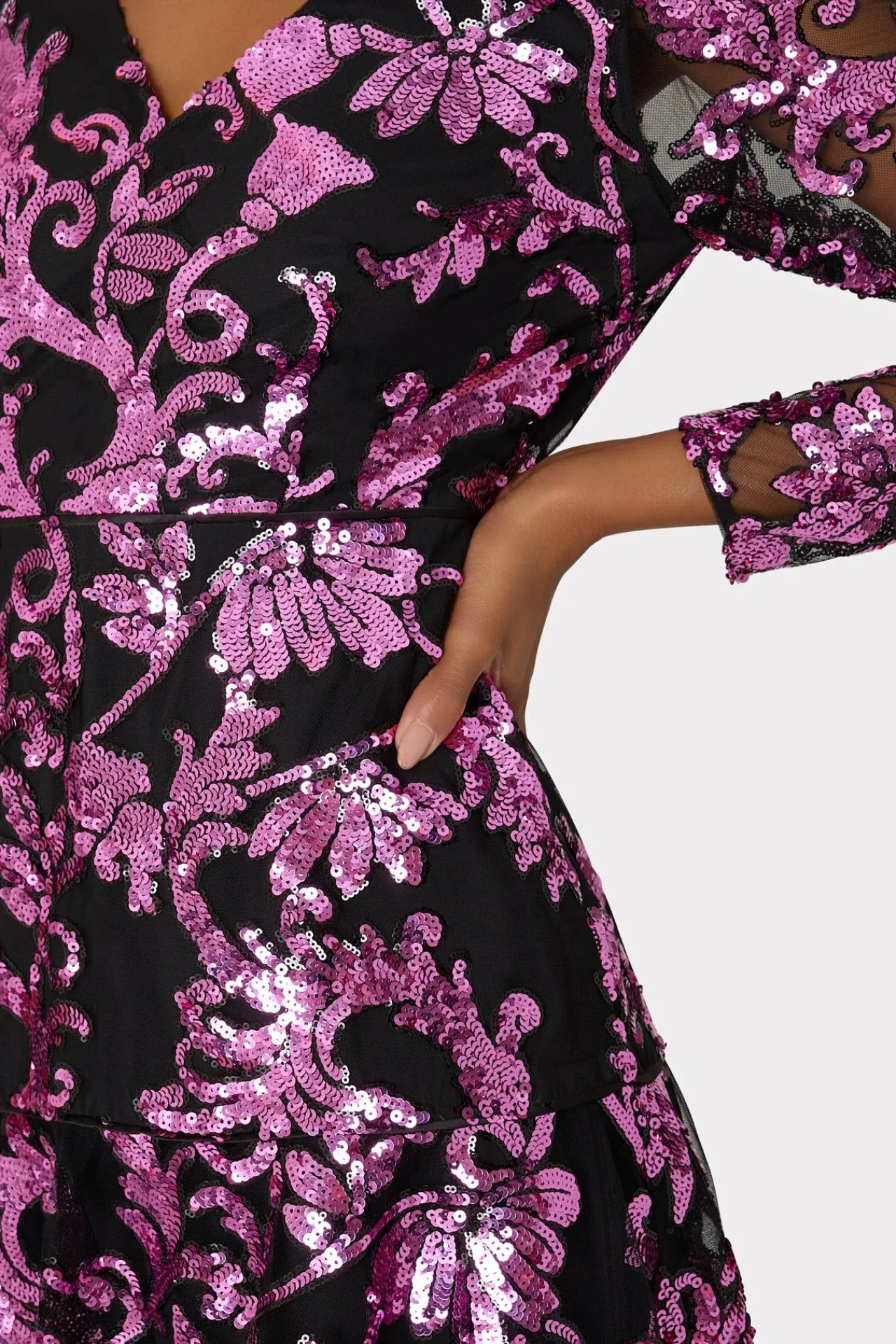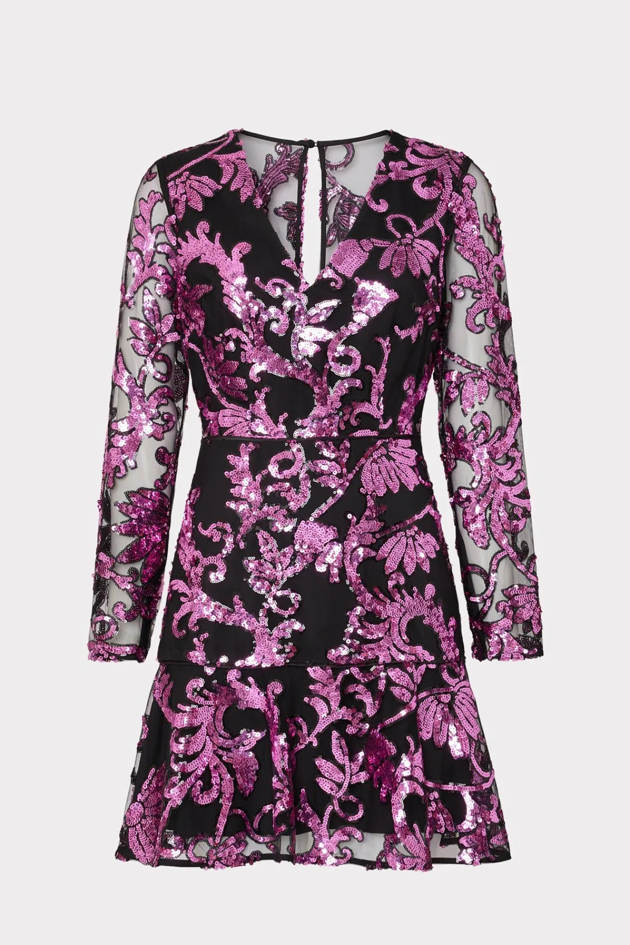 For An All-Out Glam Holiday Look, Our Tove Dress Is Rendered With Long Sheer Sleeves And A Ruffled Skirt—All Done With Our Sparkly, Paisley Mesh Sequin Overlay. All You Need To Complete This Look Is A Pair Of Ankle Strap Heels.