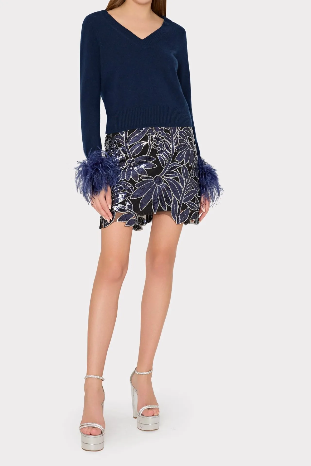 This Mini Skirt Is Beyond Ready For Party Season. This Ultra Mini Silhouette Features An Overlay Of 3D Floral Sequins—A Milly Signature. Wear Yours With A Milly Feather Cuff V-Neck Sweater And A Pair Of High Heels.