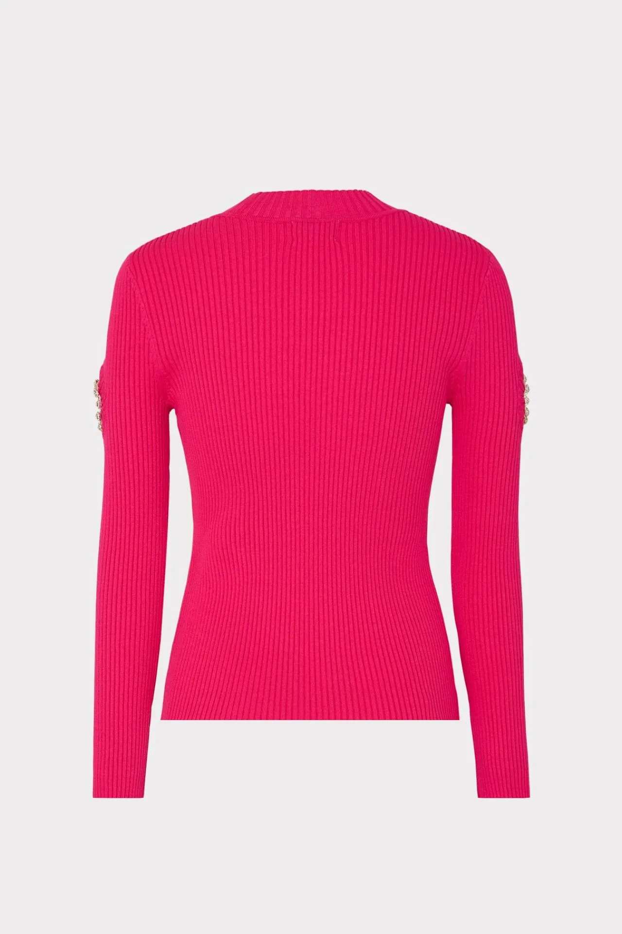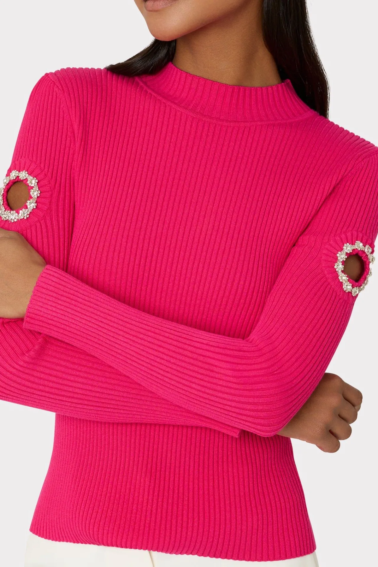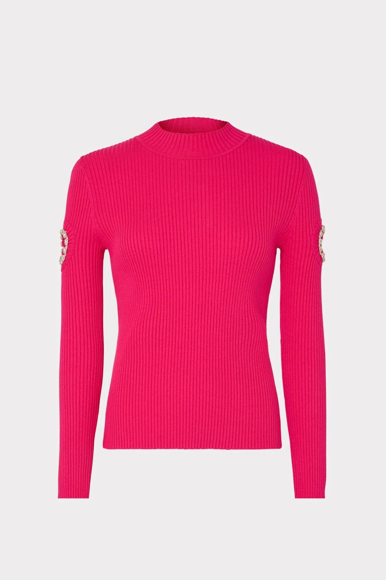This Sporty And Sleek Love Sleeved Ribbed Knit Features A Cozy Mock Neckline. It Has Cut Out Details On Each Arm That Are Bedazzled With Unique Rhinestone Trim Detail. Wear It With Denim Or Tuck It Into Your Favorite Milly Pant.