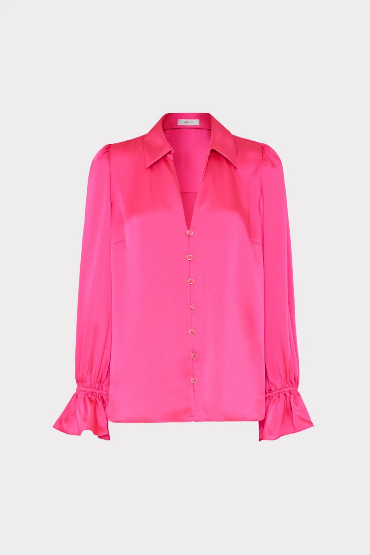 Rendered From Luxurious Satin, This Slightly Low-Cut Button Down Is Designed With A Slinky Peasant Sleeve. Consider It The Perfect “Board Meeting Blouse” That Also Likes To Meet For After-Work Drinks. Style Yours With Any Of Our Coordinating Milly Pants And Skirts.