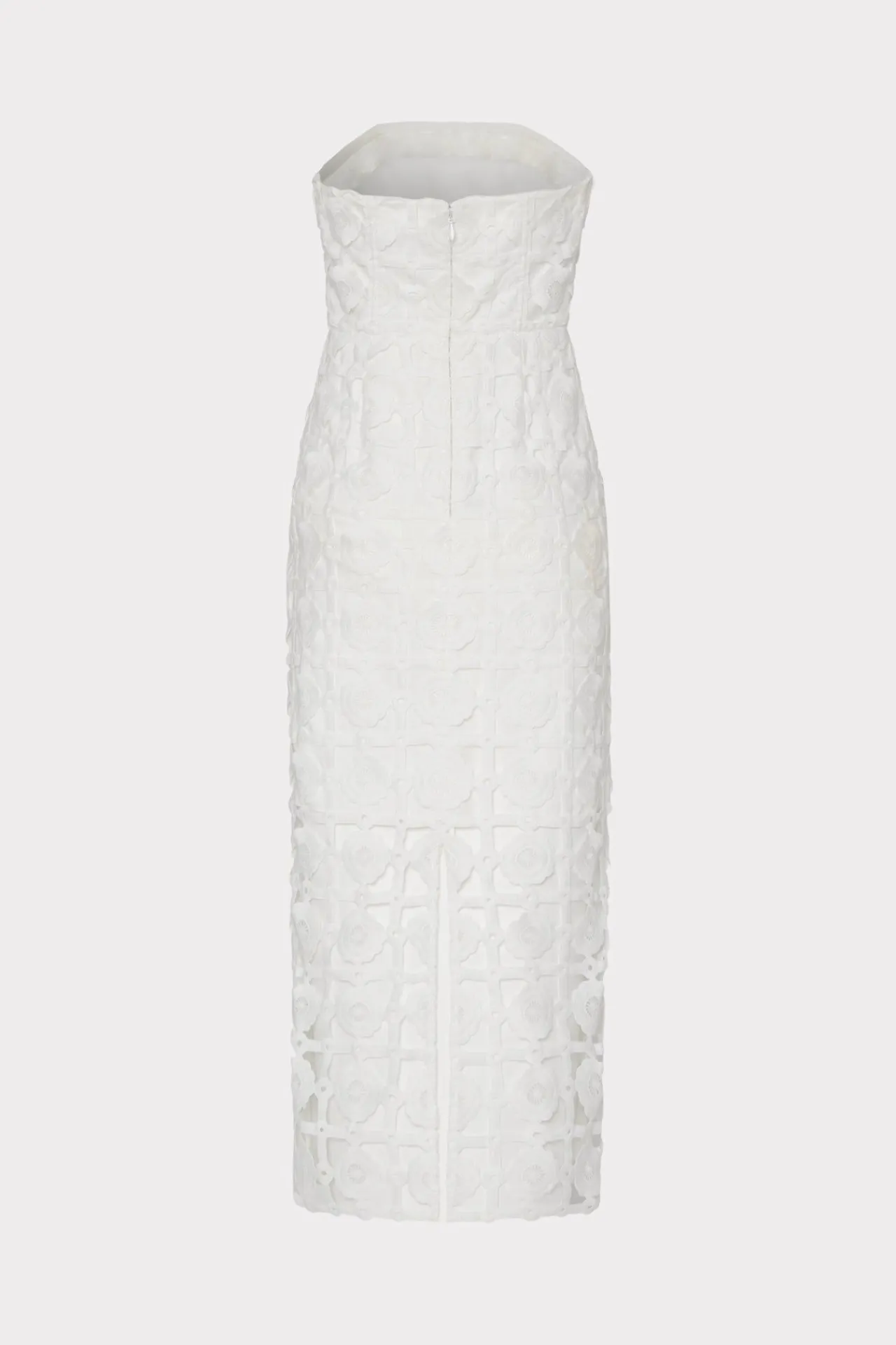 For Your Next Exclusive Party, Bring The Glamour With Our Strapless Kait Dress. This Ankle Length Dress Features An Artisanal, Textured Tile Pattern That Serves As An Overlay To Reveal Bare Legs Past The Knee. It Has A Boned-In Bodice For Shape And A Chic, Straight Silhouette. Style Yours With An Ultra High Heel.